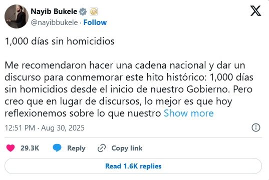“1.000 días sin homicidios desde el inicio de nuestro gobierno. Me recomendaron hacer una cadena nacional y dar un discurso para conmemorar este hito histórico. Pero creo que en lugar de discursos, lo mejor es reflexionar sobre lo que nuestro país ha vivido y sobre todas las fuerzas que intentaron impedir que llegáramos hasta aquí”, escribió Bukele.