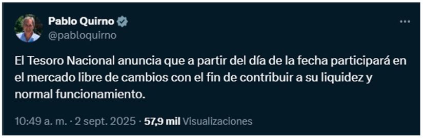 “El Tesoro Nacional anuncia que a partir del día de la fecha participará en el mercado libre de cambios con el fin de contribuir a su liquidez y normal funcionamiento”, escribió el funcionario.