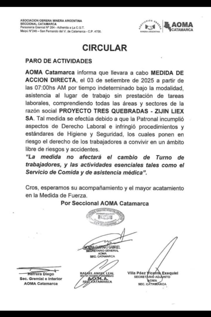 03/09/2025 10:25 — ProvincialDesde la madrugada del 3 de septiembre, la Asociación Obrera Minera Argentina (AOMA) Seccional Catamarca comenzó una medida de fuerza en el Proyecto Tres Quebradas – Zijin Liex SA, ubicado en Fiambalá.