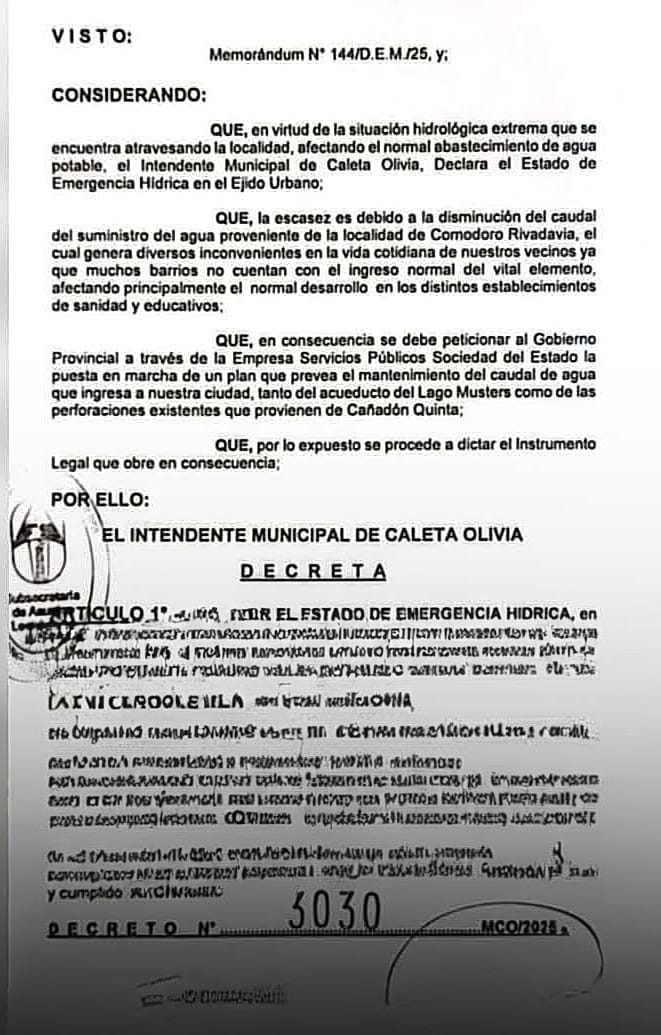La profunda crisis en el suministro de agua que afecta a Caleta Olivia llevó al intendente Pablo Carrizo a firmar un decreto que declara el Estado de Emergencia Hídrica en toda la ciudad. La medida tiene como objetivo implementar acciones inmediatas para optimizar el uso del recurso, garantizar su distribución equitativa y coordinar esfuerzos con organismos provinciales.