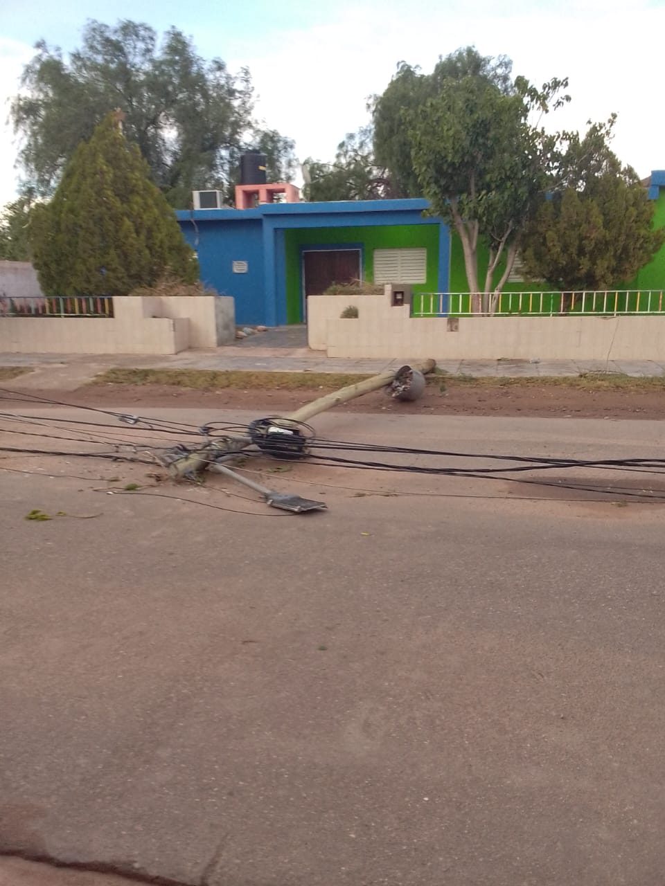 Las arterias Hipólito Yrigoyen y Eva Perón amanecieron bloqueadas por postes quebrados y tendidos eléctricos esparcidos sobre el pavimento, generando preocupación entre los vecinos que no pueden circular y temen por la seguridad eléctrica en el sector.